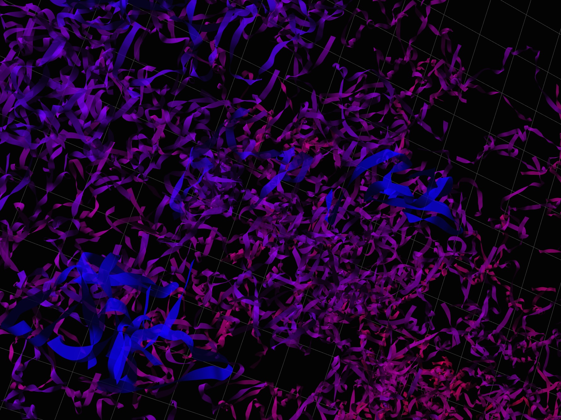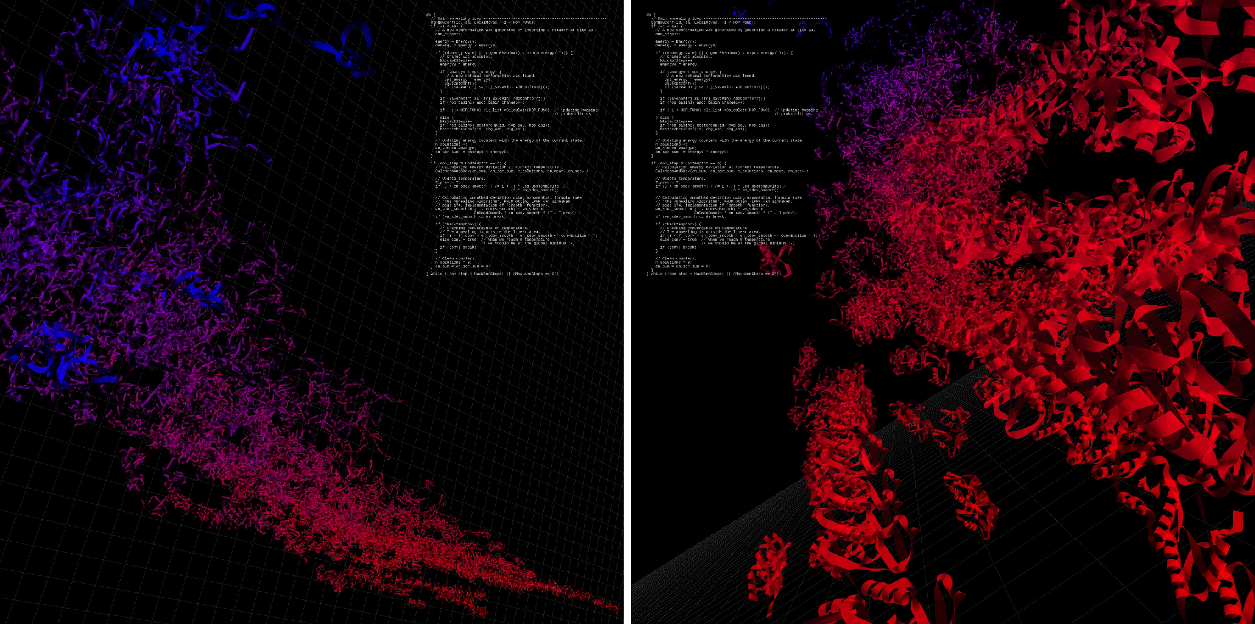 Convergence-Divergence is a visualization of all the folding simulations I generated during my research on protein folding, for a particular protein called ubiquitin. These visualization show the convergence of the simulations towards the native conformation, and the divergence from the initial random coil: