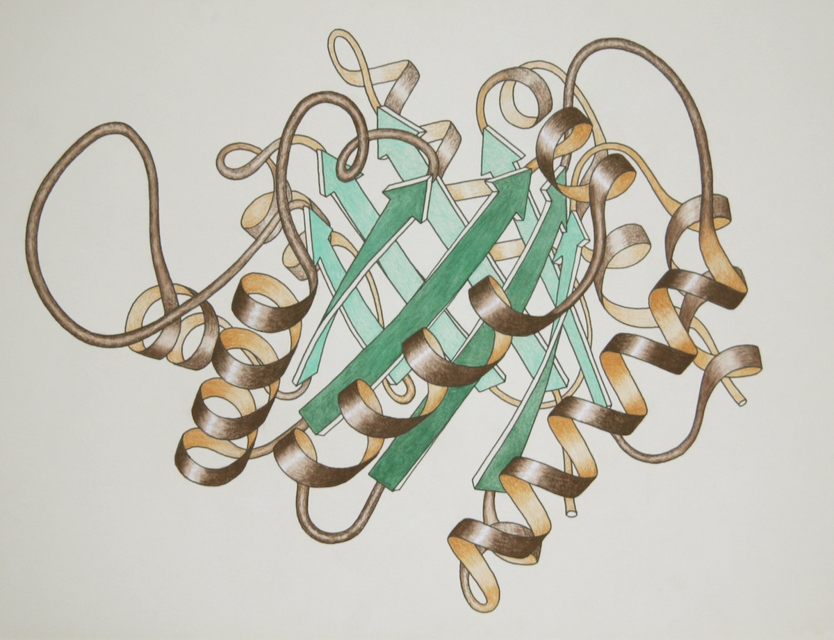 YAPView’s Windows installer and source code (written in Delphi!) are still available on Sourceforge, even though I’m no longer maintaining it. As the name of the tool suggests, there are many other biomolecular visualization tools. The idea of using ribbons to represent these complex molecules goes back to the Jane Richardson at Duke University, which originally used this technique to crate beautiful hand-drawn renderings of proteins such as the one below: