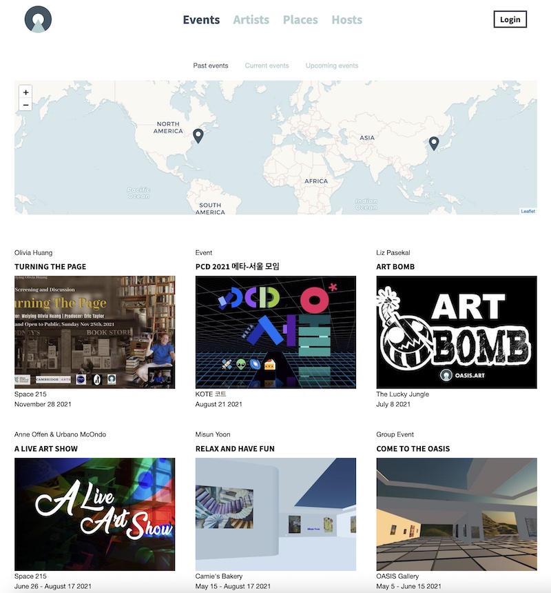 OASIS is an independent open-source art platform designed to connect artists with space providers and audiences in the local communities. I was initially conceptualized by Jihyun Kim and I. The goals of this platform are (1) to make more spaces available to artists to show their work, (2) to give space providers a unique channel to announce the availability of their spaces and the type of work they are looking for, and (3) to provide audiences the means to find and experience the artworks currently on display and to connect with local creators. The OASIS webapp was developed by Carlos Cruz, and it is live at oasis.art.